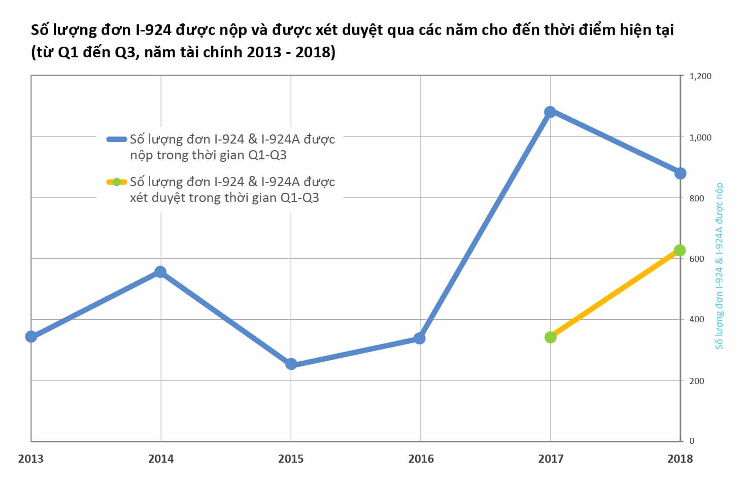 Số lượng đơn I-924 được nộp: USCIS (Sở Nhập tịch & Di trú Hoa Kỳ) chỉ nhận được 25 đơn I-924 trong Quý 3 năm tài chính 2018, giảm 95% số lượng đơn so với cùng kỳ năm ngoái và cũng là con số thấp nhât trong vòng 6 năm qua.