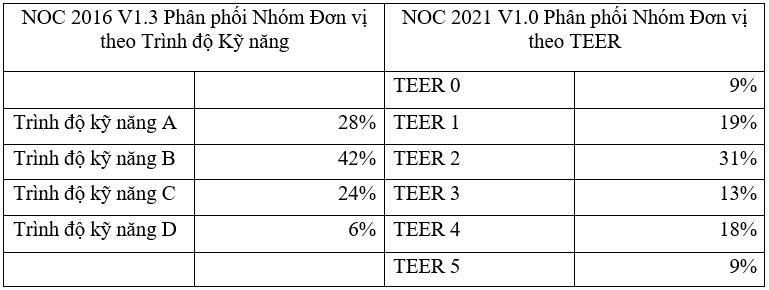 Công cụ Thống kê Canada này cho phép các cá nhân xem NOC hiện tại của họ tương ứng như thế nào với NOC 2021. Bảng dưới đây cung cấp chỉ báo về cách bốn cấp độ kỹ năng NOC đã được phân bổ lại trên sáu nhóm TEER mới.